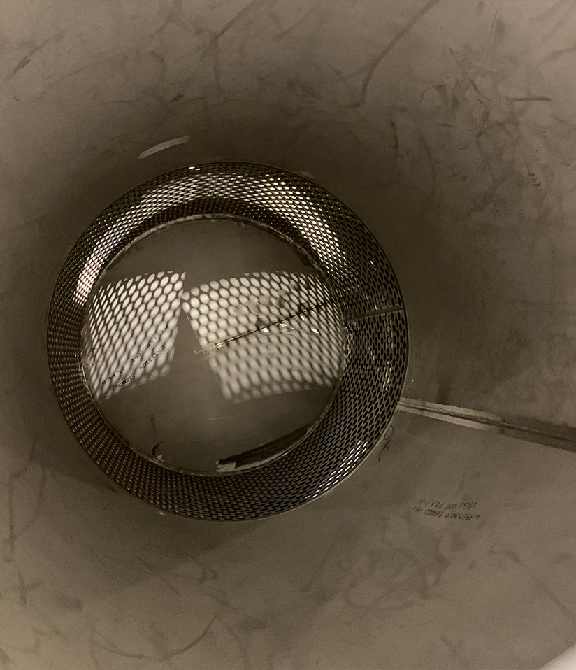 Cold condensate enters via water inlet into the dome section, via several small sprayers. From there, the water is collected by the first tray, which is partly perforated and lets the water trickle down to the next tray.
